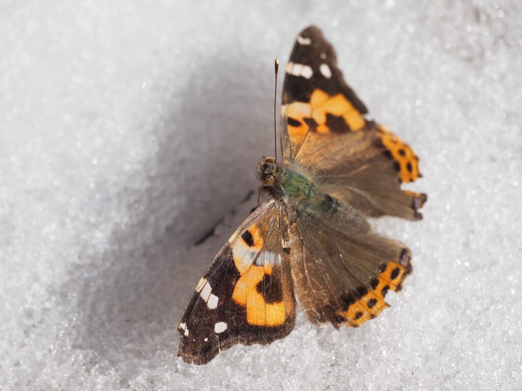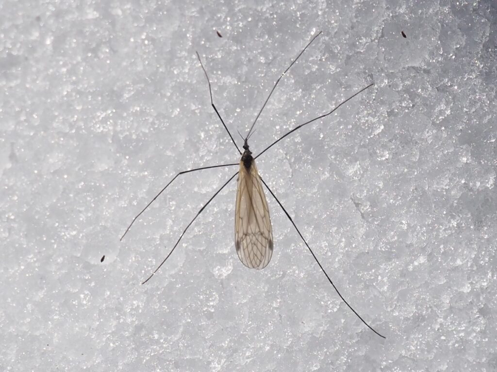 12月上旬、アキアカネはまだ飛んでいますが、さすがに雪が降ると、虫の姿はめっきり減りました。そんな雪にも負けじと活動している昆虫がいました。ヒメガガンボ科の一種と、アカタテハです。何を好き好んでか、わざわざ雪の上に降りていましたが、どんな意味があるのでしょうか。