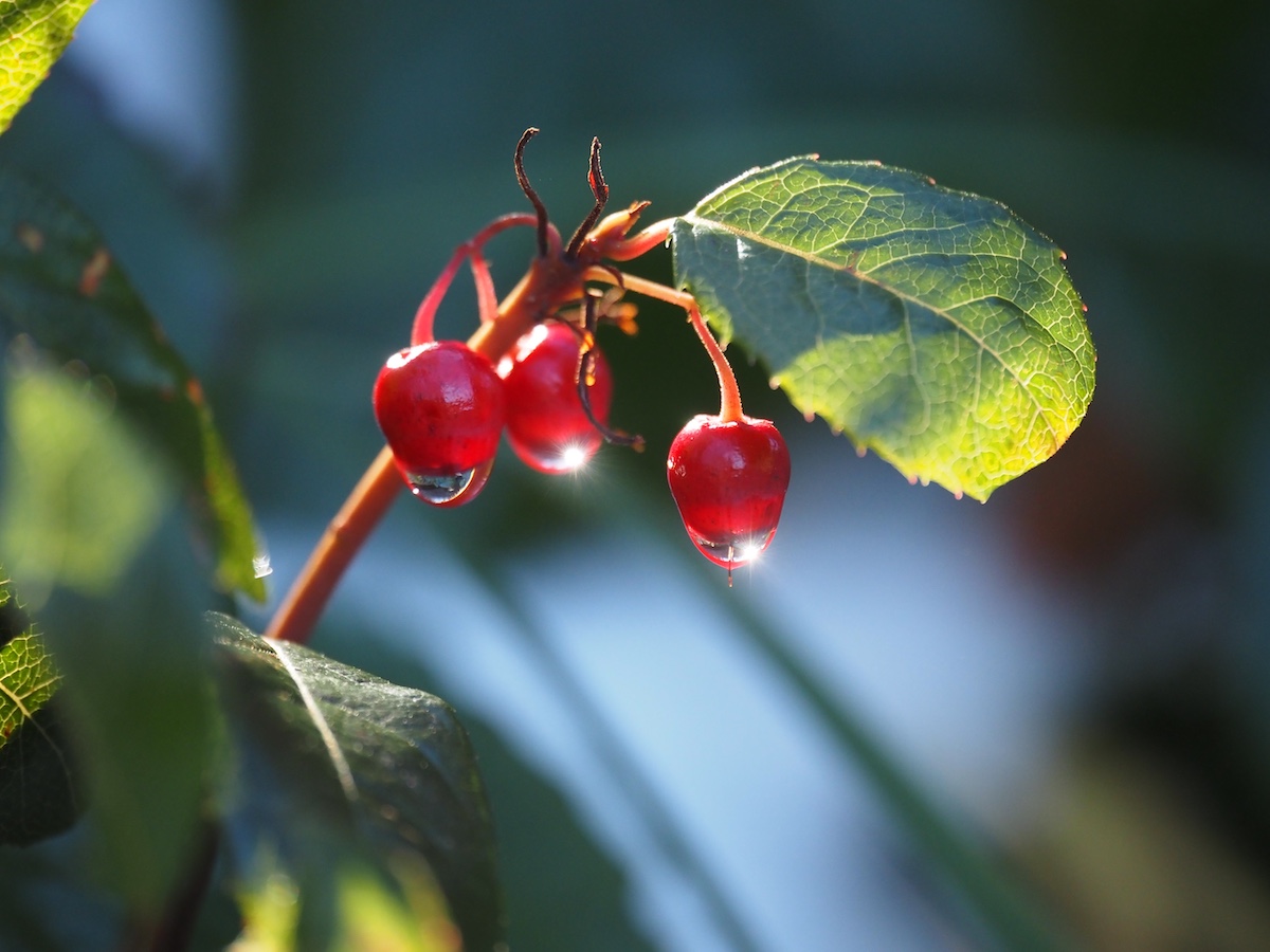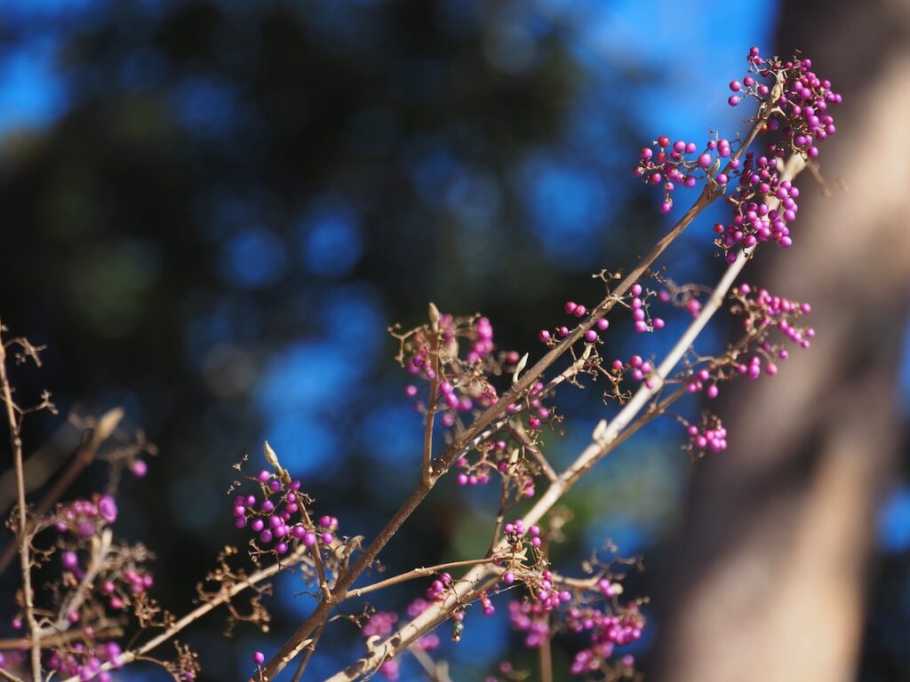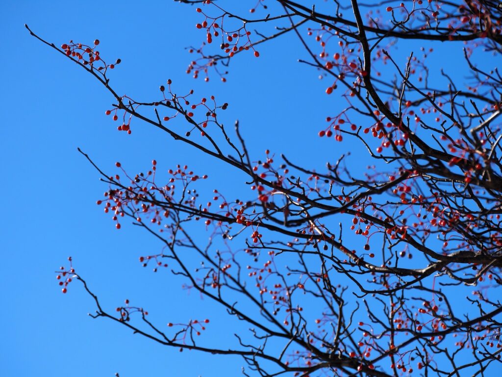 12月上旬、落葉樹の殆どが葉を落として、森の中の見通しが随分良くなりました。そのお陰で、葉陰に隠れて見えにくかった樹木の果実が目立つようになりました。権現堂周辺ではアズキナシ、景勝屋敷ではムラサキシキブとスイカズラの果実が実っていました。いずれも生食はできませんが、果実酒に利用することはできるようです。