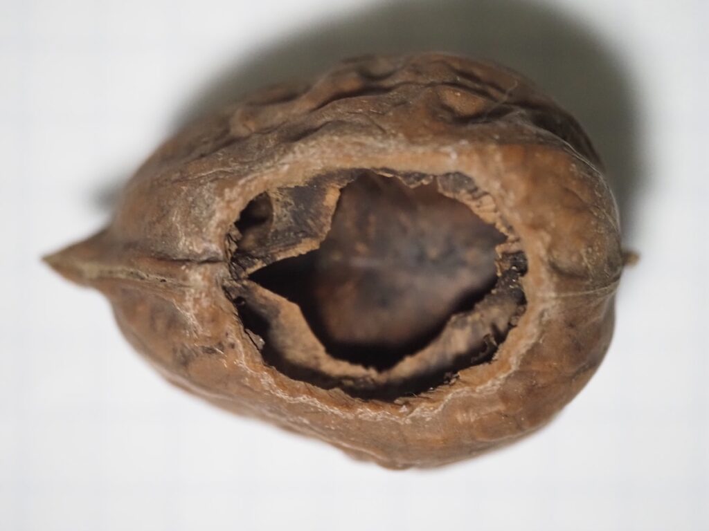 なぜこれがアカネズミの食べた痕だと分かるかというと、縫合線を齧って丸く穴を開けるのがアカネズミの特徴だからです。大抵裏側にも穴を開けて、両側から実を器用にほじくり出して食べます。ネズミの他にリスやイノシシもクルミを食べますが、