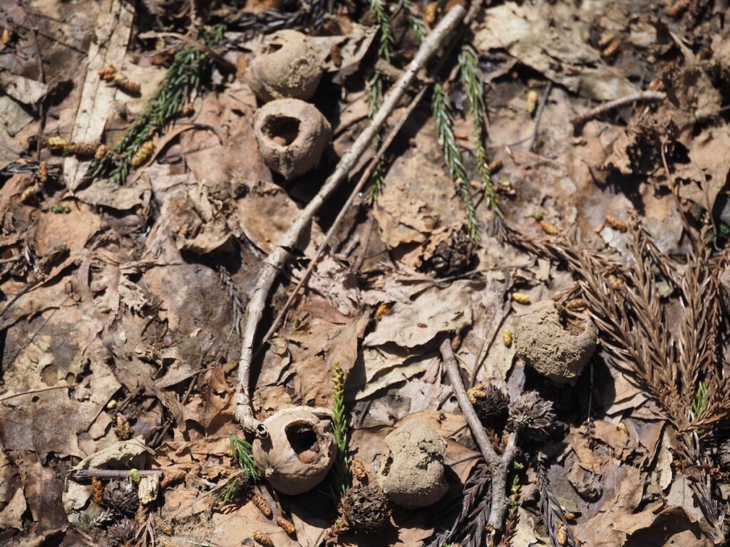 さらに歩いて南三の丸の少し手前まできたところで、クルミの殻がたくさん落ちていました。これはアカネズミがクルミの実を食べた後で、実際には山の至る所に落ちているのですが、複数のクルミの殻が1枚の写真に収まるほどまとまって落ちているのは初めてです。