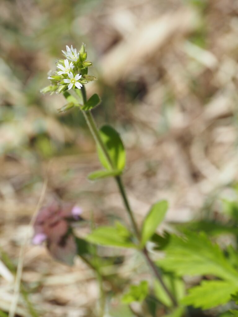 オランダミミナグサは、愛宕谷公園でも大手道でも、いろいろなところに生えている小さな白い花です。名のとおり、欧州原産の外来種ですが、鑑賞目的で庭に植えられることもあるようです。