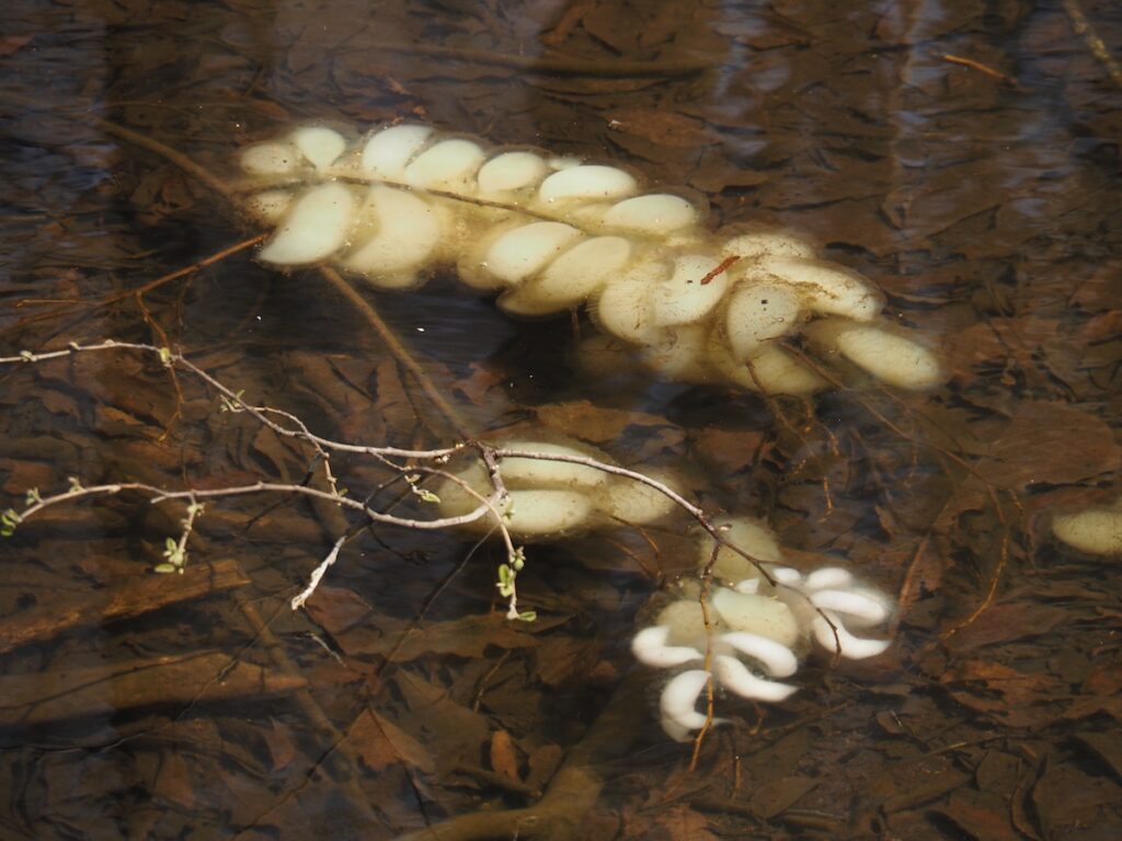 この池にアケビのような形の白い塊がいくつも沈んでいました。クロサンショウウオの卵塊です。こんなところにサンショウウオが棲息しているんですね。そのうち、オタマジャクシが泳いでいるのが見られるかもしれません。クロサンショウウオは新潟県版レッドデータブックで準絶滅危惧種に指定されています(4)。