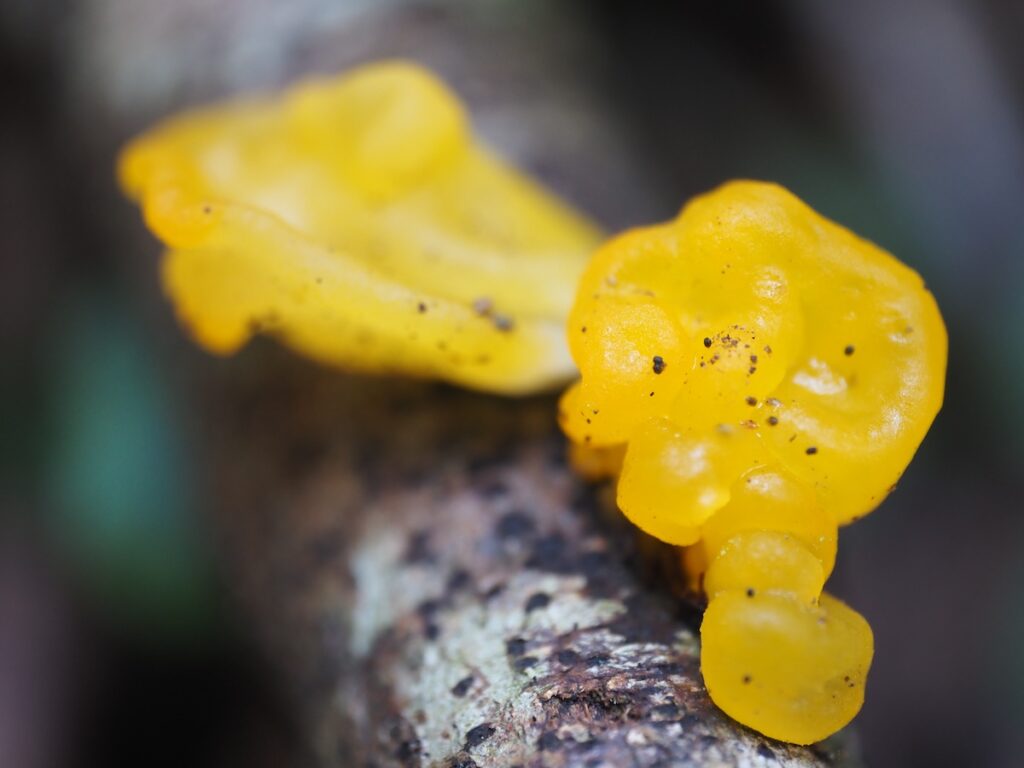 左に進んでみると、鮮やかな蛍光イエローの小さなキノコが倒木の上に生えていました。コガネニカワダケです。全国に分布する、ありふれたキノコだそうですが、とても目立ちます。見た目どおり、キクラゲの仲間ですが、食べられるかどうかは定かではないようです。
