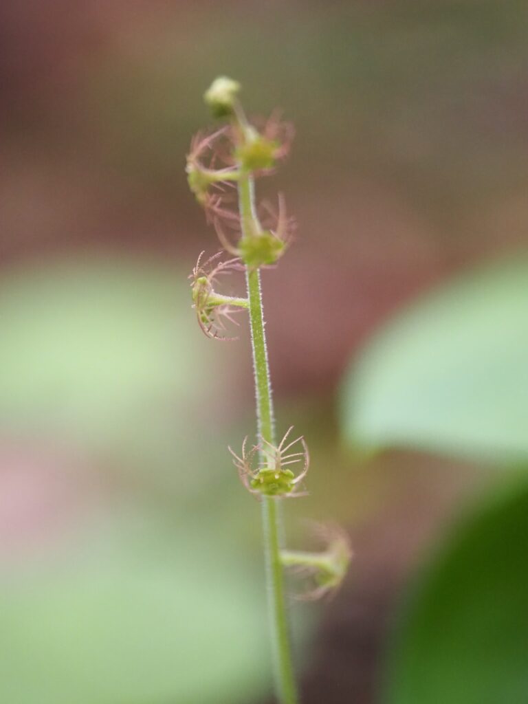 春日山の大手道で、コシノチャルメルソウの花を見つけました。昨年は花を見逃して、果実だけになったのを「なんだこれは?」と散々悩んだのですが、今回どうにか見つけた花は何しろ目立たない上に妙な形で、これが茎に螺旋状についています。