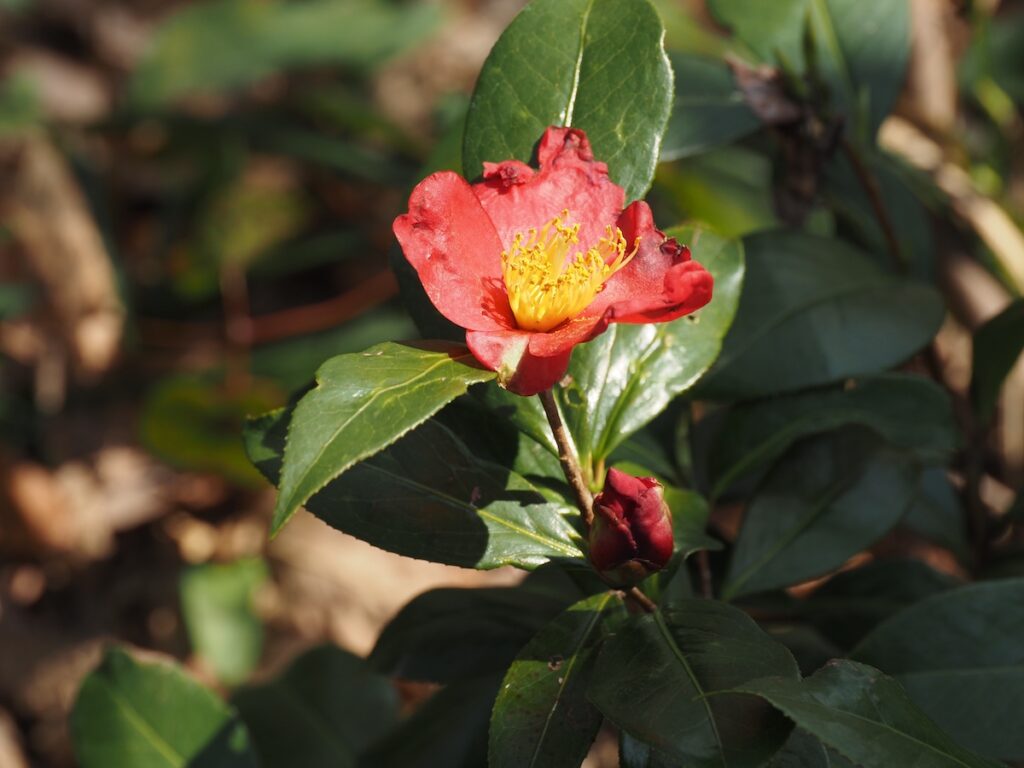 南三の丸を過ぎ、権現堂に向かって登って行く途中、森の中にユキツバキの花が咲いていました。薄暗い森の中に差し込んだ光がユキツバキの赤い花を照らし出すと、そこだけひときわ明るく見えるのが不思議です。