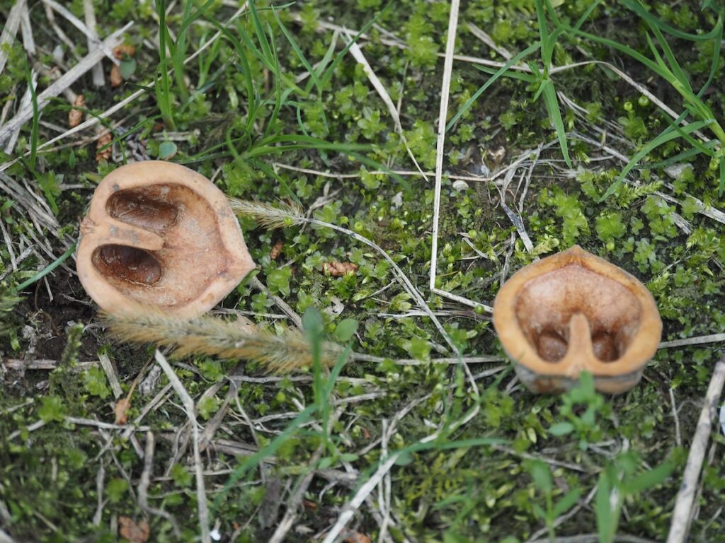 リスはこんなふうに縫合線を全部齧って上手に二つに割りますし、イノシシに至っては、強力な顎の力で噛み砕きますので、実を食べた後の殻の状態が三者三様でまるで違うのです。