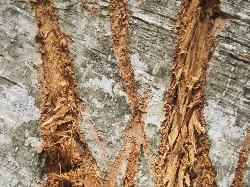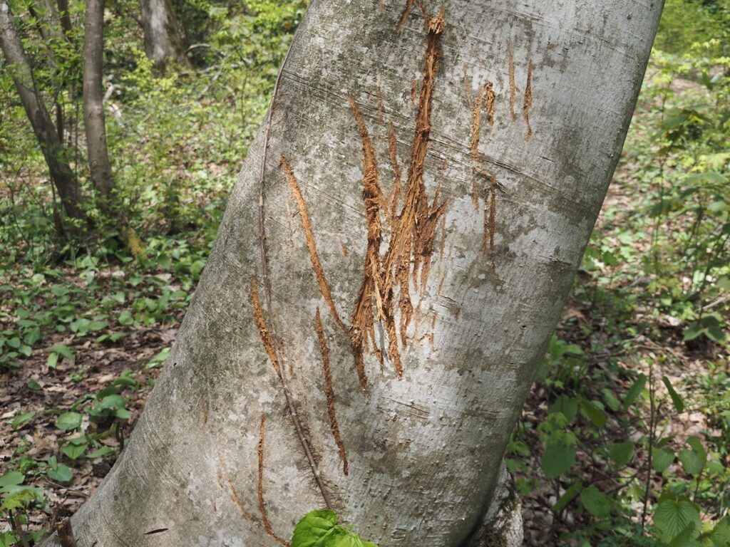 そうやって動物の痕跡を探しているうちに、シカの角研ぎ痕を見つけました。なかなか豪快な傷痕です。こんな傷痕をつけるような角で攻撃されたらひとたまりもないですね。