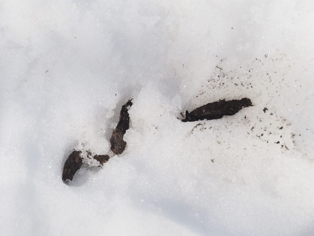 逞しいと言えば、獣も実に逞しいですね。クマやヤマネのように冬ごもりや冬眠をする獣はむしろ少数派で、キツネもタヌキもシカもカモシカもテンもイタチもアナグマもリスもネズミもイノシシも、厳しい冬でも活動しています。そんな彼らの活動の痕跡を様々な形で観察できます。雪の上にはウサギ、キツネ、シカの足跡が幾筋もあり、キツネの糞やウサギの糞もところどころに落ちています。普段姿が見られないのは、昼間はほとんど活動していないからですが、こうして足跡がたくさん残されているのを見ると、野山や里には意外にたくさんの獣が棲んでいるということに気付かされます。